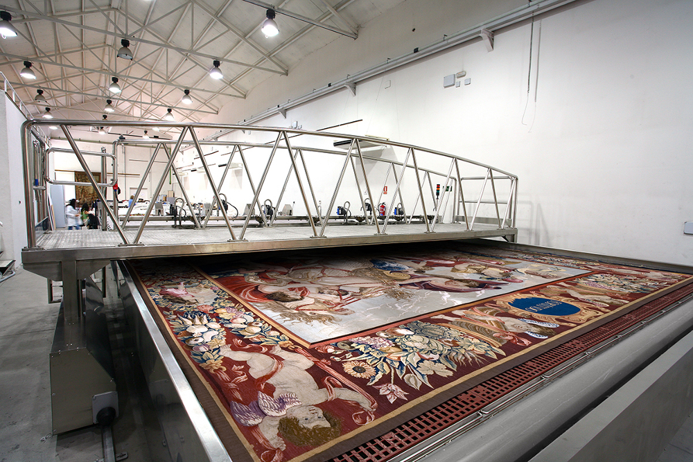 Los trabajos han consistido en el desmontaje de la pieza, un proceso delicado y de precisión, y su posterior recogida y traslado, por responsables de la Real Fábrica de Tapices de Madrid, para proceder a una limpieza en profundidad, así como a una revisión de nudos.