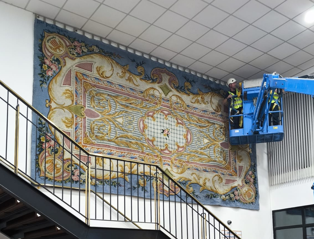 Tras dos meses de tratamiento, el tapiz vuelve a la sede de la compañía para ser expuesto en su ubicación original, después de haberse llevado a cabo el saneamiento de la pared y la colocación de unas nuevas sujeciones.